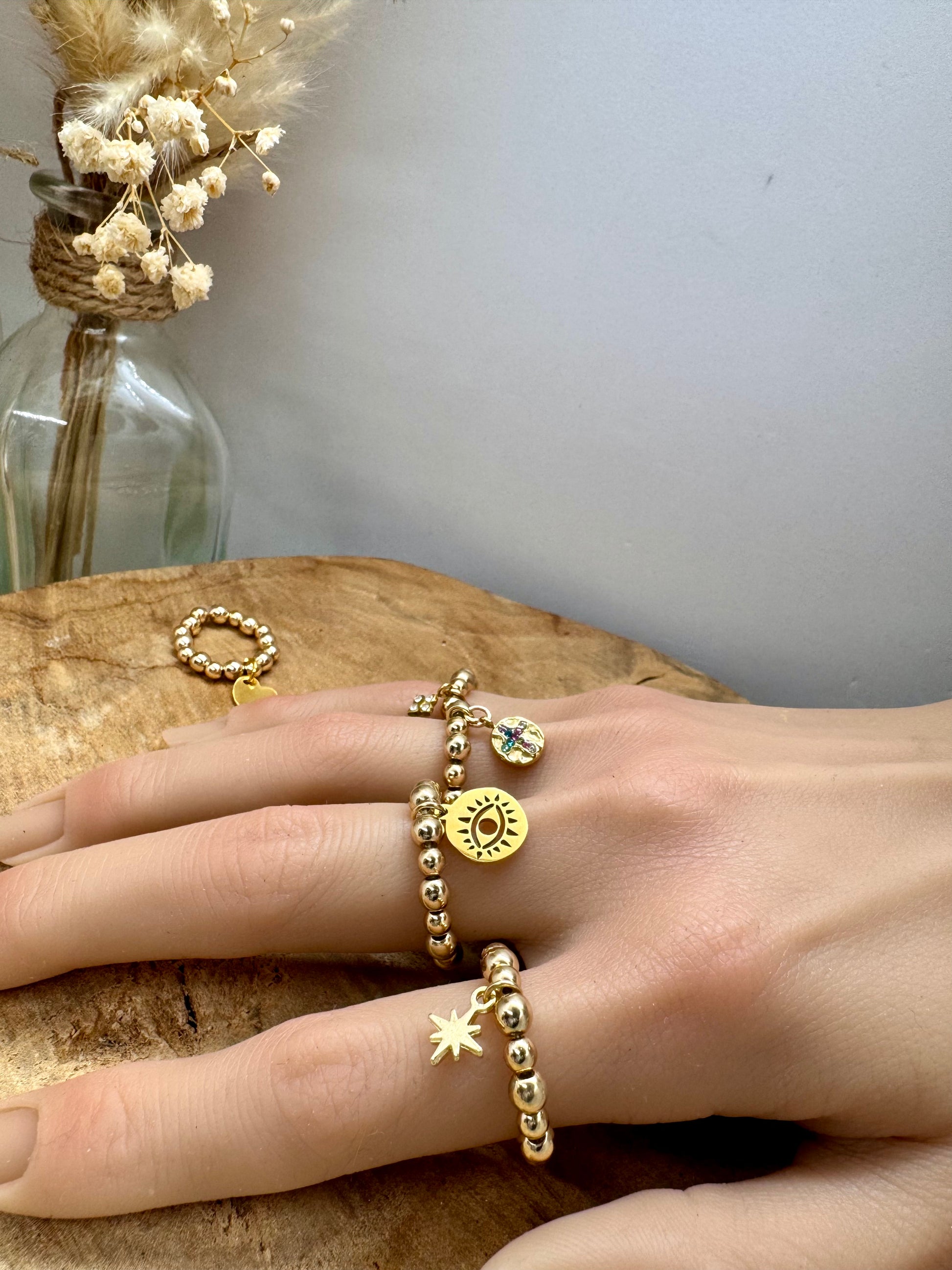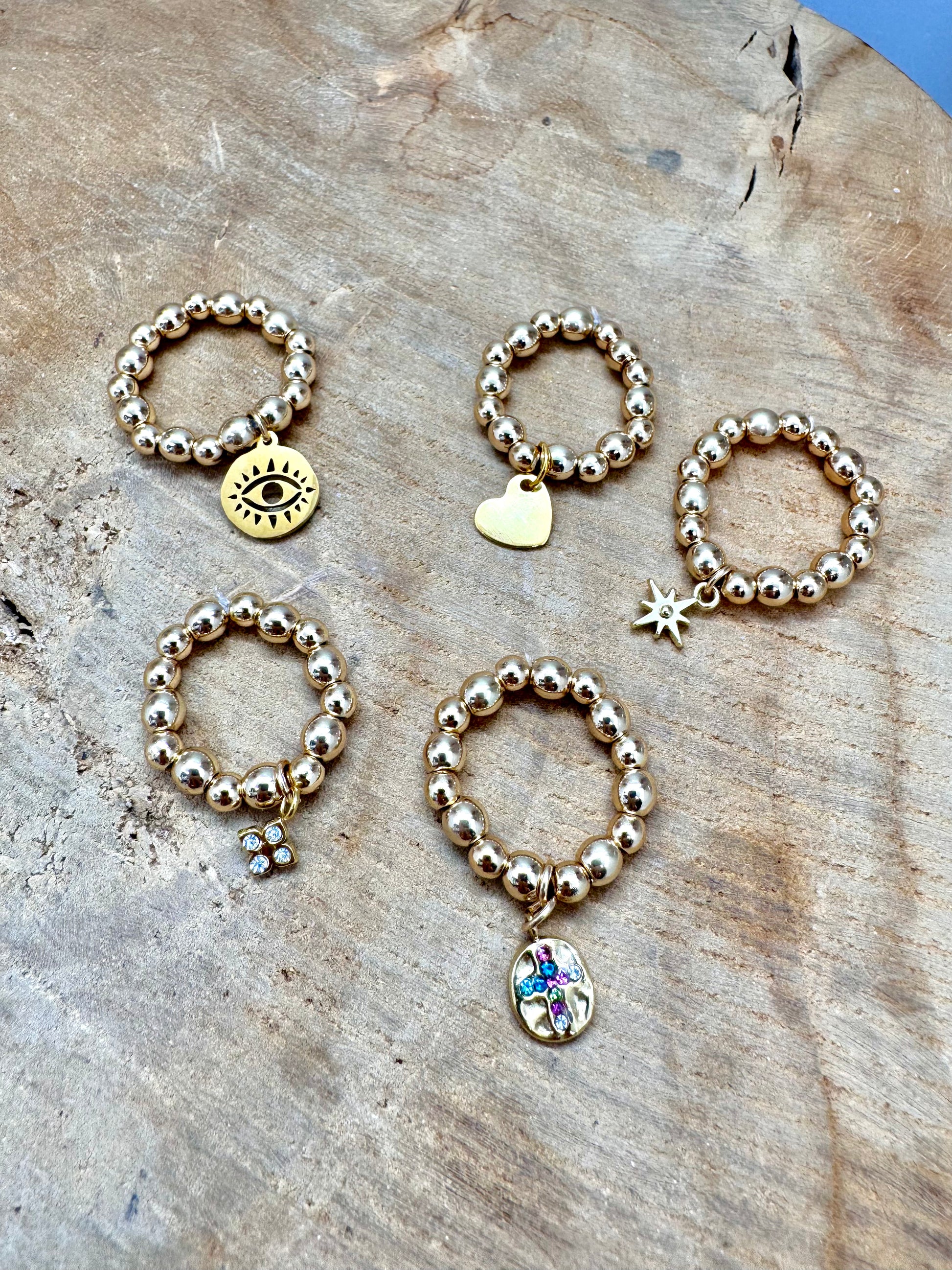 Bague dorée en hématite elastiques tendance – breloque au choix