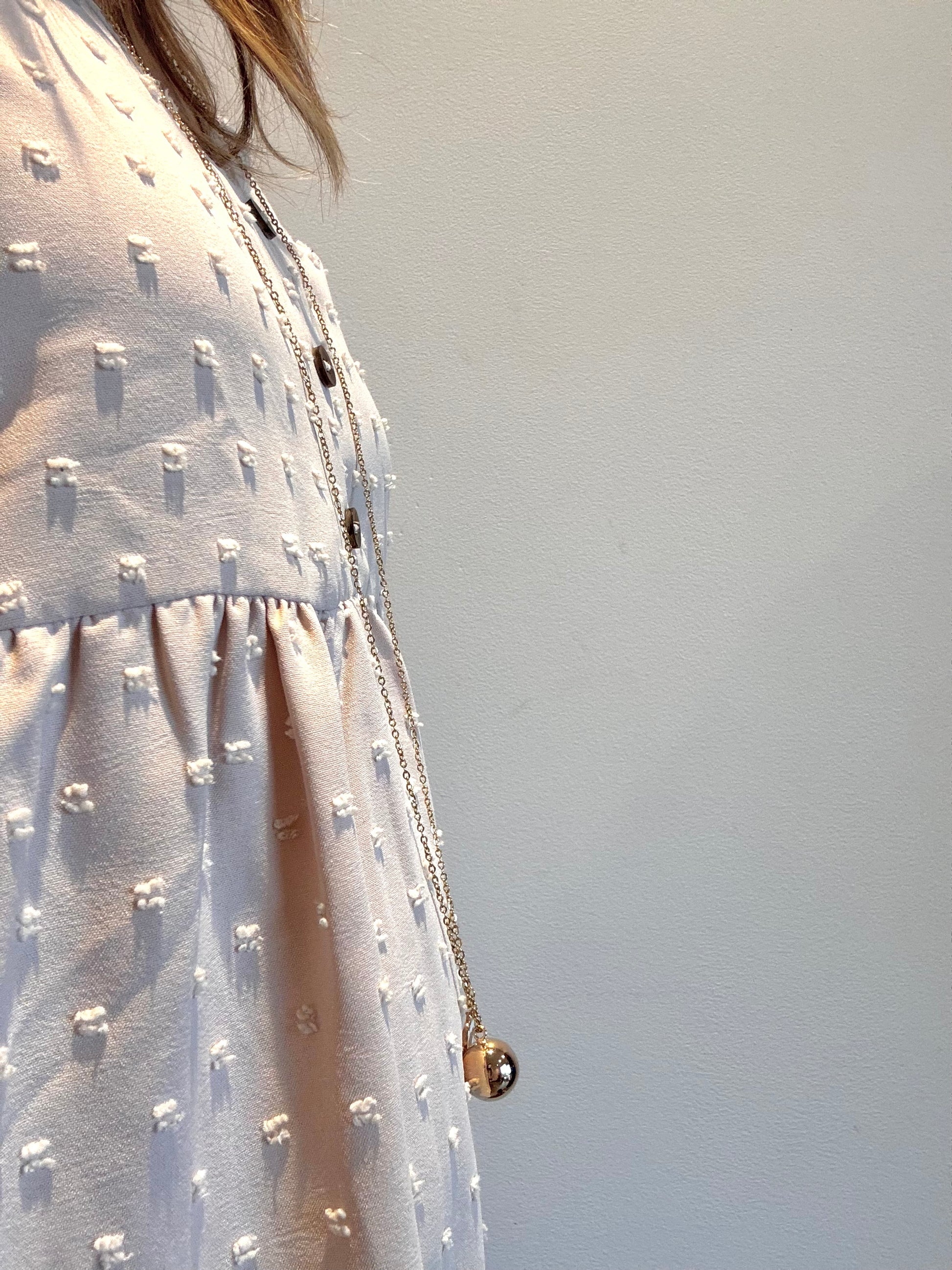 - d’une boule dorée lisse, renfermant un tintement doux et apaisant, pensé pour bercer bébé in utero ;
