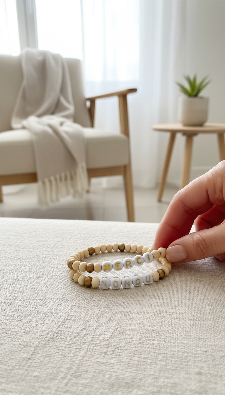 Petits bracelets en bois à message, élastiques, qui s'adaptent à tous les poignets, avec un message, que vous pouvez personnaliser avec le prénom de la personne que vous souhaitez remercier, ou alors un petit surnom